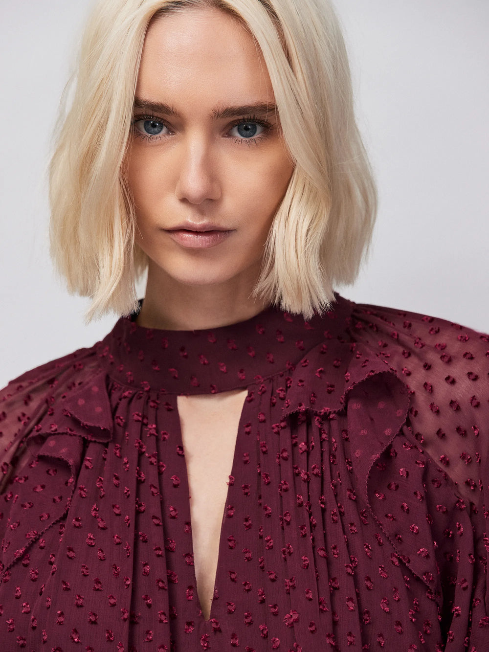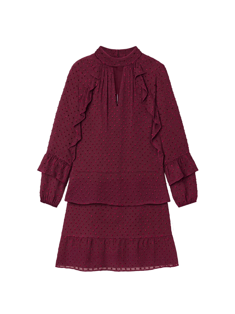Light, fluid and full of charm. Crafted with a soft dobby texture and finished with delicate ruffles, it’s fully lined for a smooth fit and features button fastenings through the front. The mini length brings a playful balance, perfect for day-to-night styling. Style with knee-high boots for a polished daytime look or pair with heels and gold jewellery for evenings out.