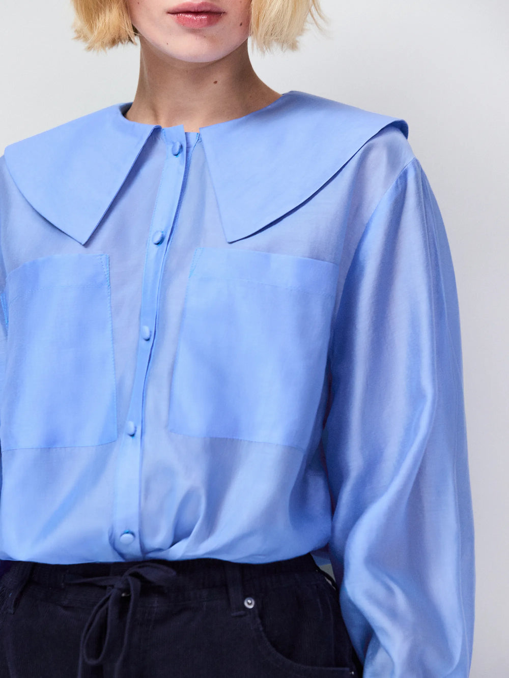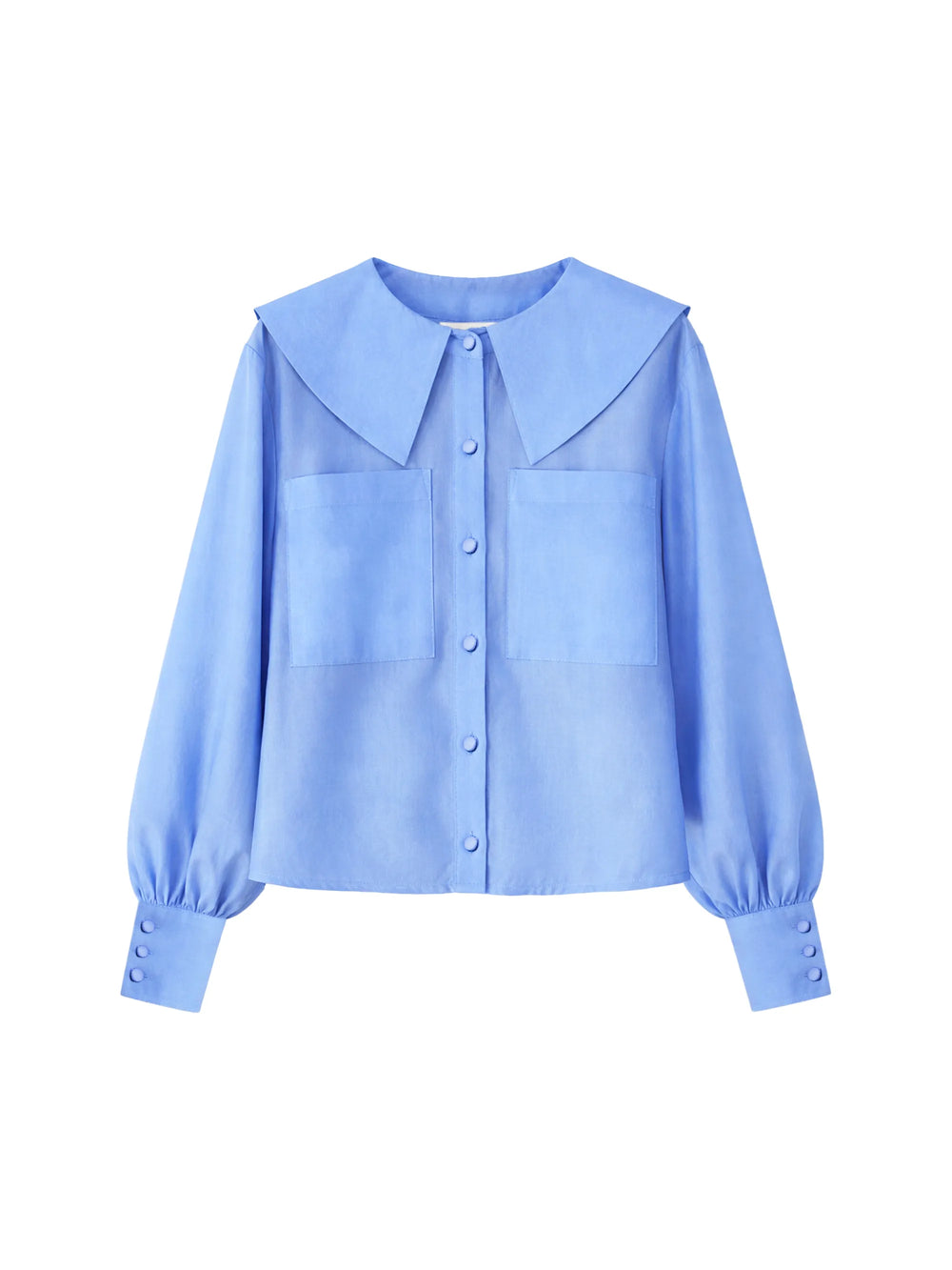 From the cornflower blue hue to the statement collar, our Lyocell-blend blouse will pull focus in your wardrobe. It has a lustrous, sheer finish, with two oversized pockets that offer coverage. We love the blouson sleeves, deep cuffs and covered buttons. Tuck yours into high-waist jeans.
