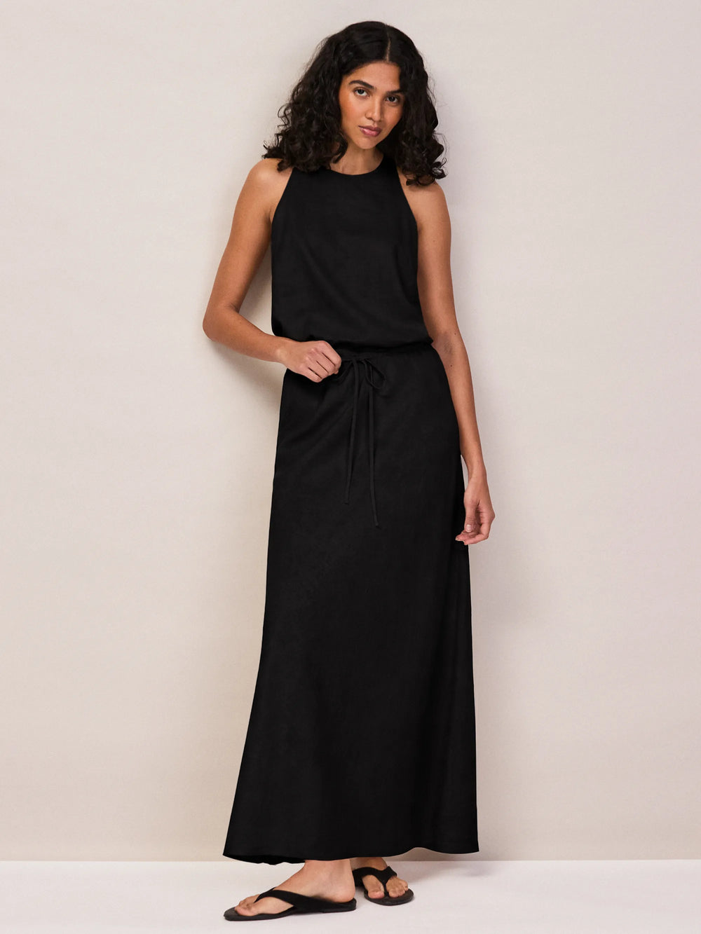 This maxi skirt is cut on the bias from a classic black linen blend for a sweeping, figure-flattering fit. It has a comfortable elasticated waist that can be worn on the natural waist or lower on the hips, and functional self-ties. Tuck in the coordinating top and finish with flat sandals.