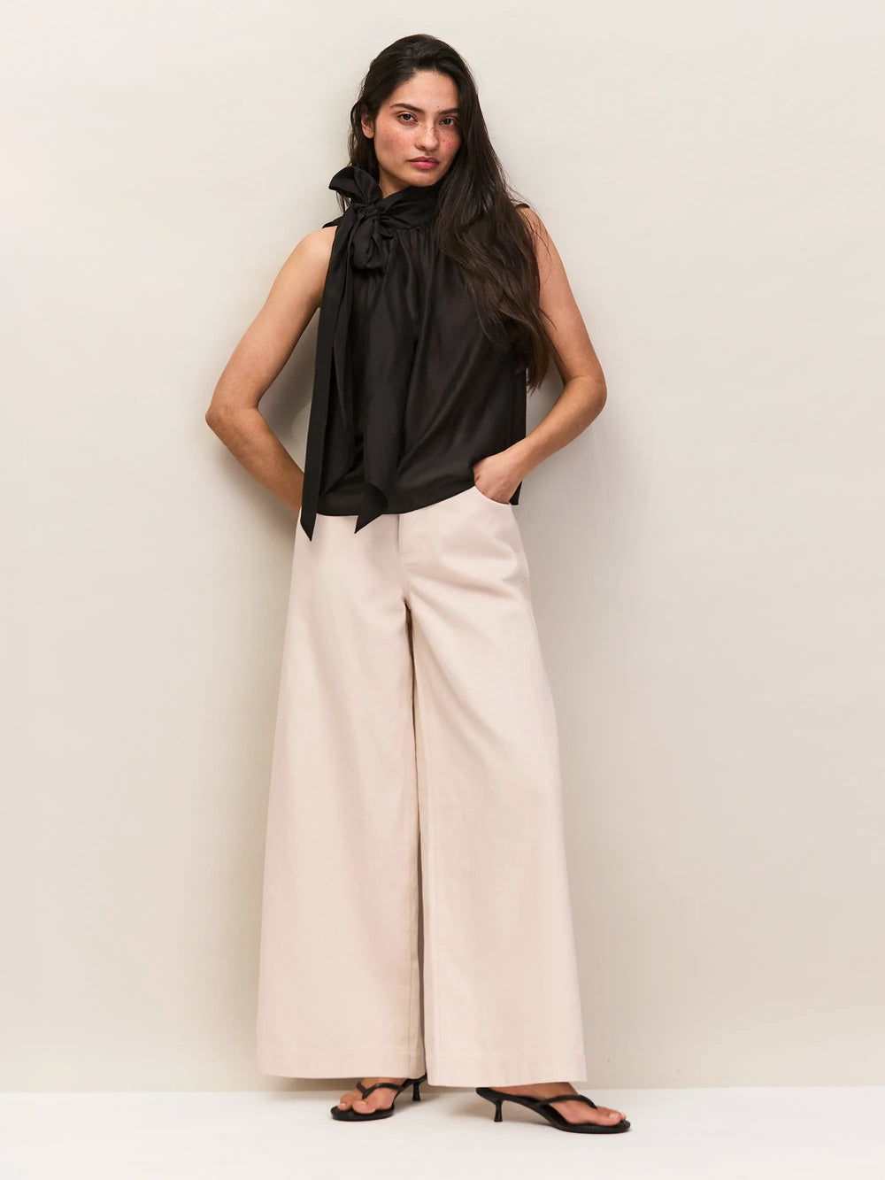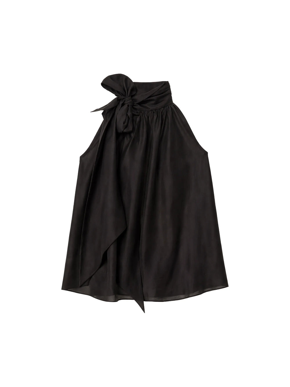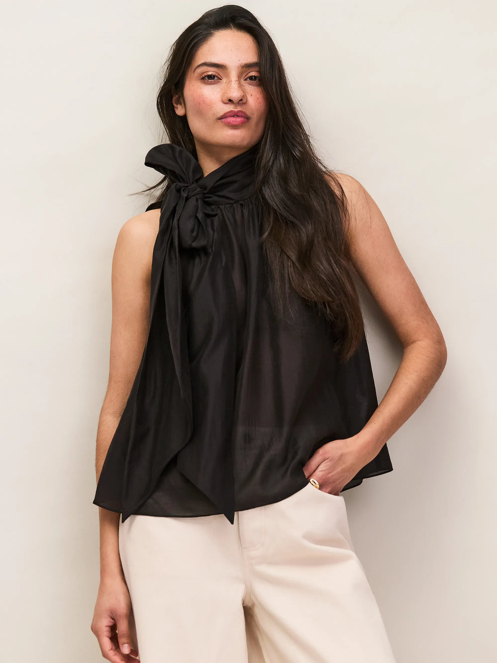 The perfect summer evening top, this sleeveless blouse is crafted from a black Lyocell-blend that drapes the figure beautifully. At the neck is a tie that can be looped into an oversized bow. The relaxed, A-line silhouette looks great with tailored trousers or jeans.