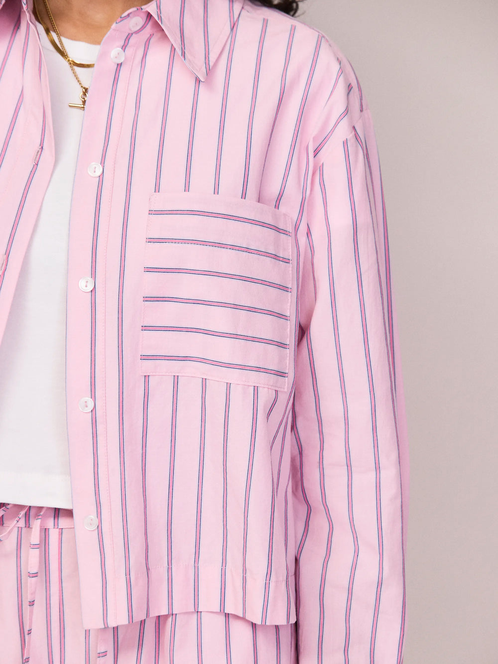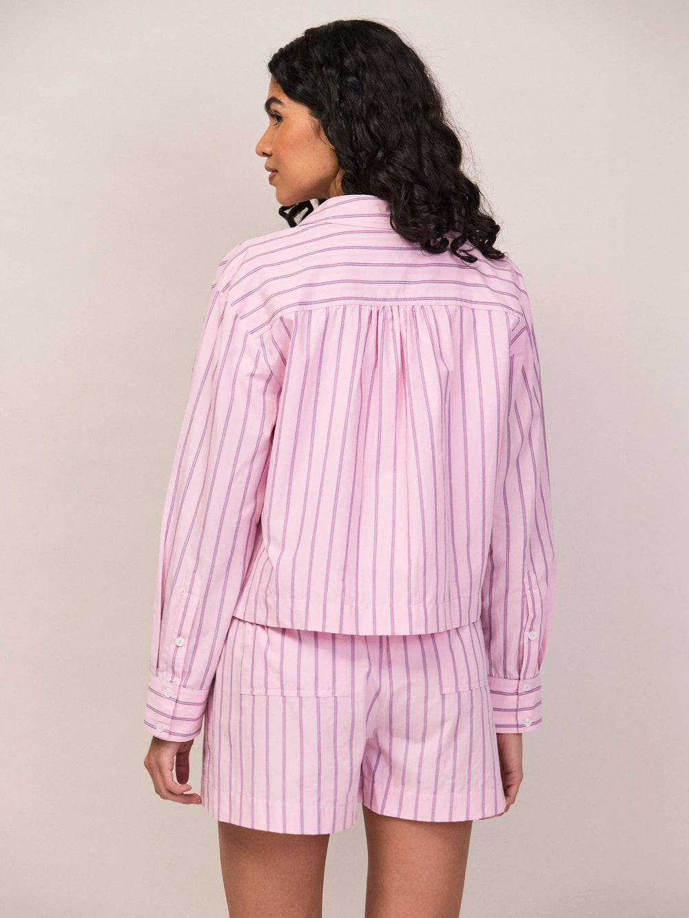 We love the cropped profile of this pink stripe cotton shirt, which lends itself perfectly to styling with high-waist trousers and shorts. It is made from pure cotton for a relaxed fit, and features a patch pocket at the chest and yoke detailing at the back. Team it with the coordinating shorts for an effortlessly polished summer outfit.