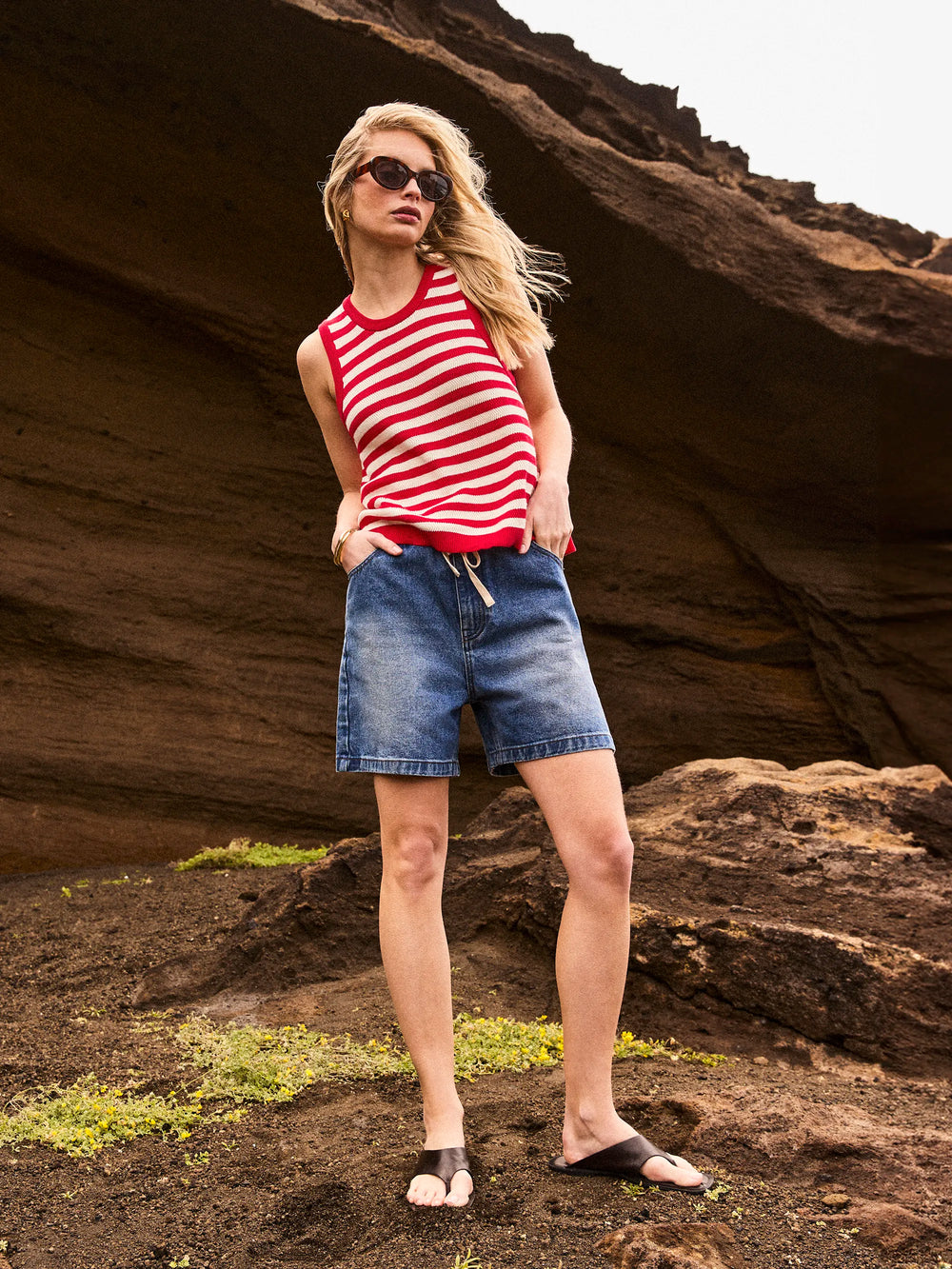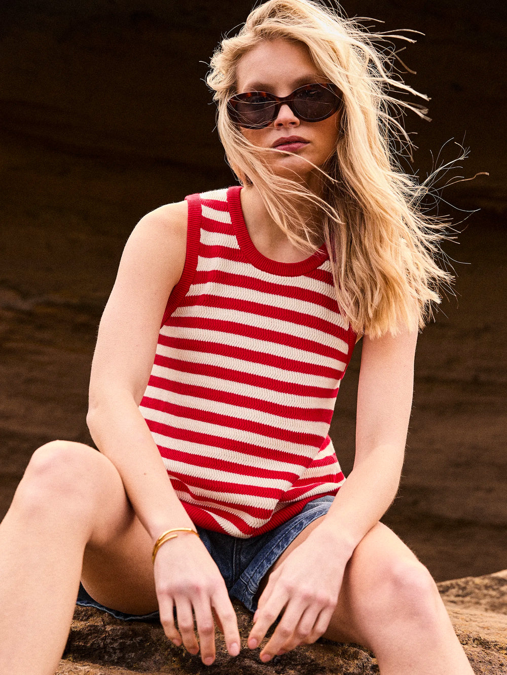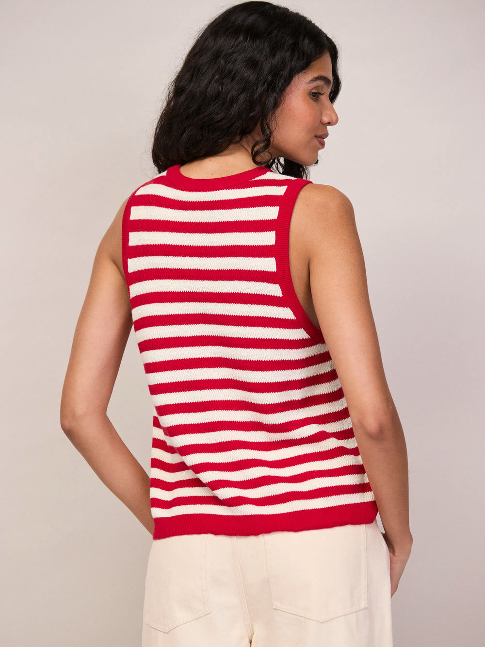 A fresh addition to your warm weather wardrobe, this red stripe shell top is knitted from 100% cotton for a soft, breathable feel. Designed with a sleeveless silhouette and classic crew neckline, it has a relaxed fit that pairs effortlessly with everything from tailored trousers to denim.