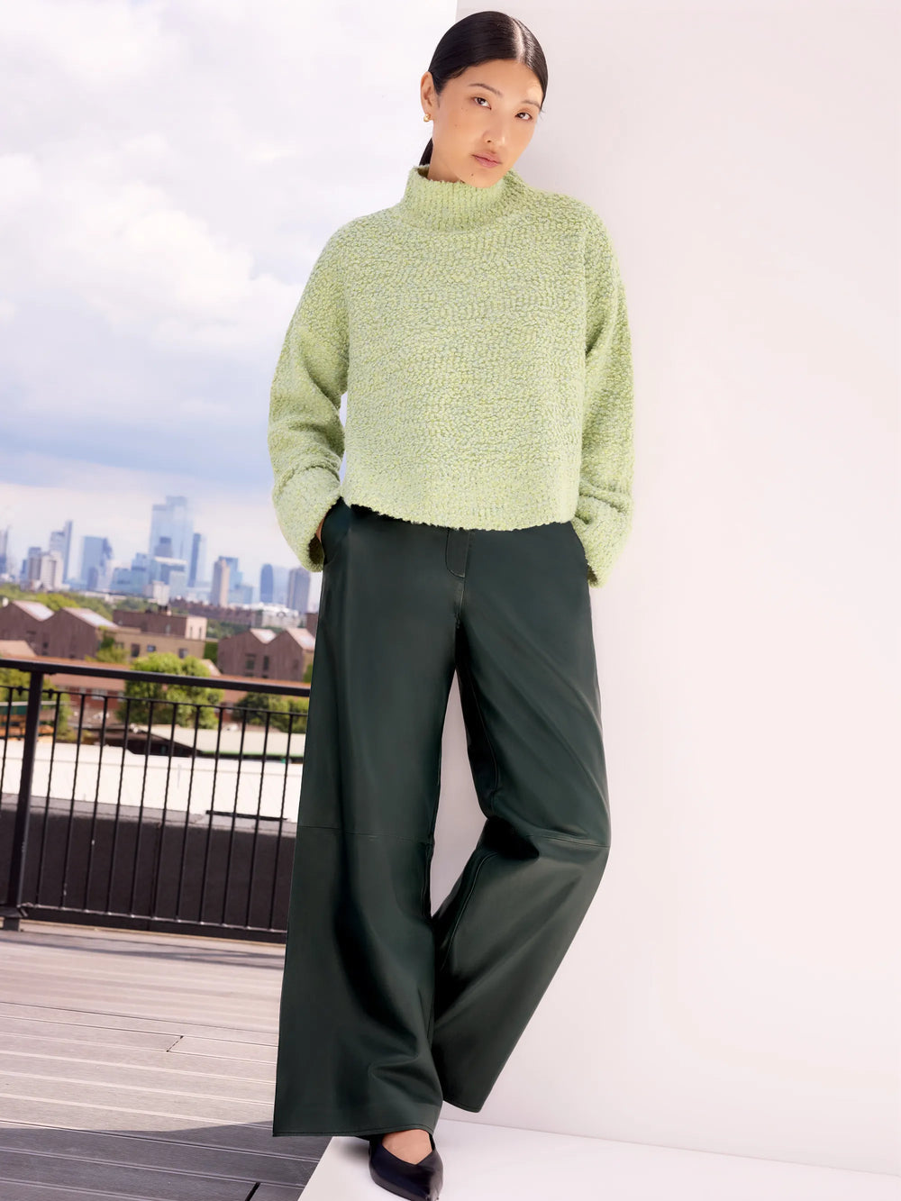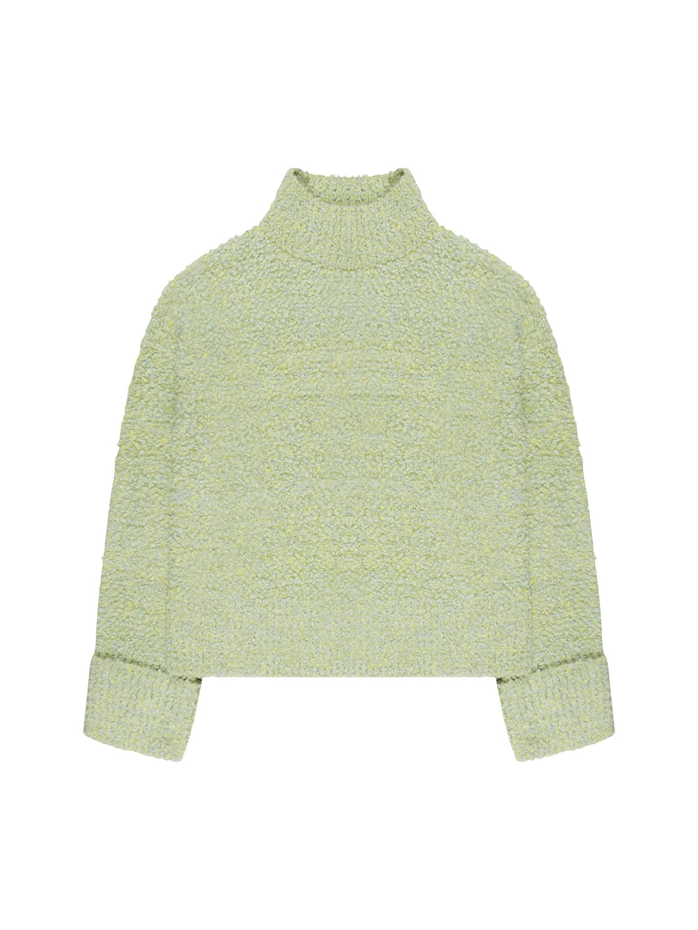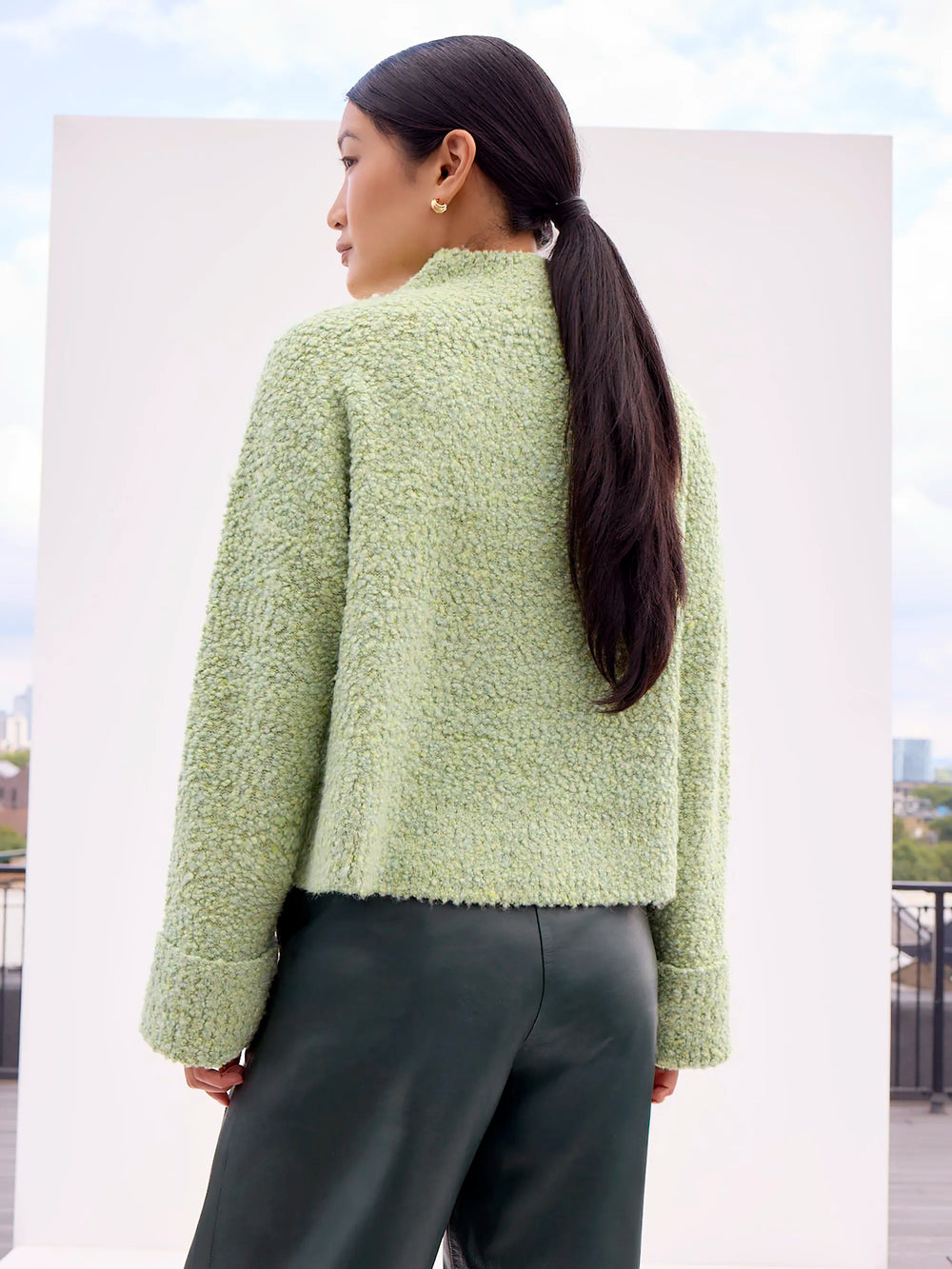 In a delicate soft green, this jumper is knitted from a soft , textured boucle yarn. With a slightly cropped, boxy shape, it has full-length sleeves with deep cuff detailing, as well as a high neck that finishes its stylish silhouette.