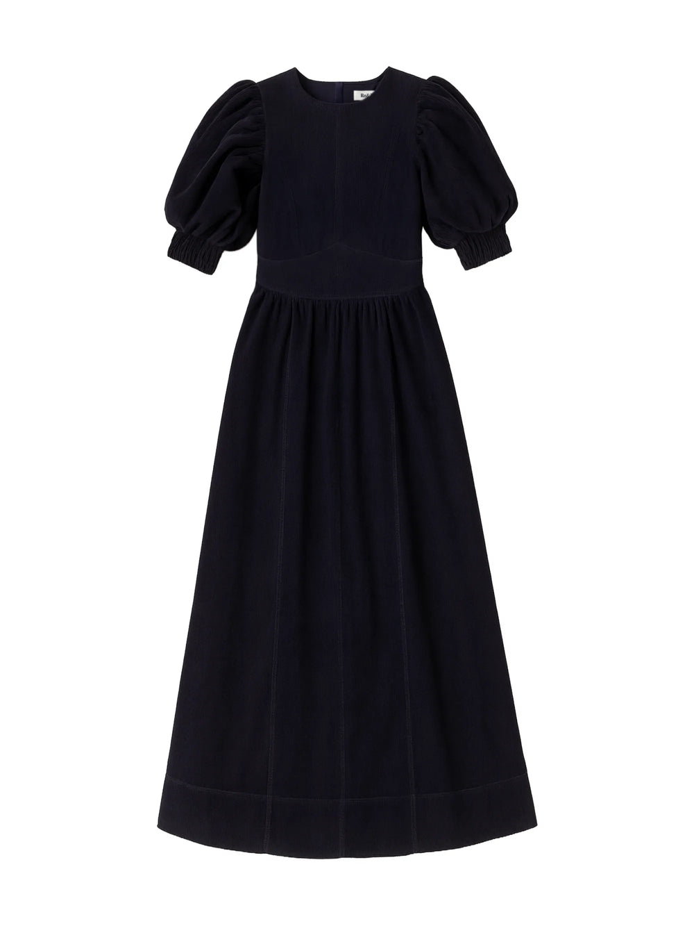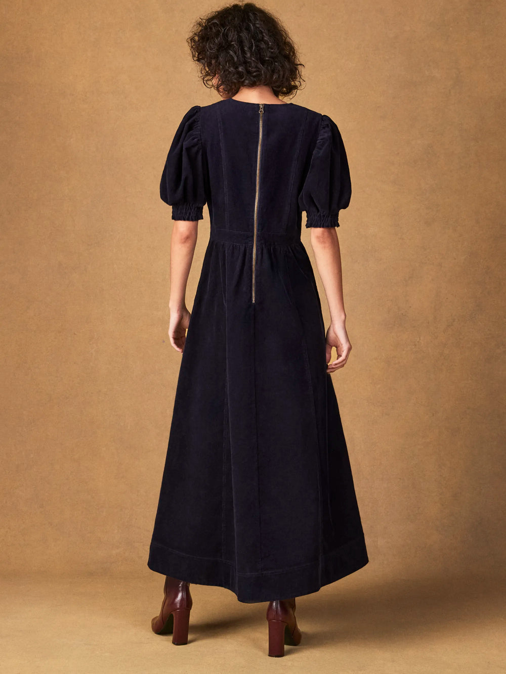 A refined take on cold-weather dressing, this navy cord midi dress blends structure and softness with ease. Crafted from plush corduroy, it features gently sculpted puff sleeves with shirred cuffs and subtle bodice seam detailing that enhances the silhouette without feeling overworked. The back exposed metal zip adds a contemporary edge, while discreet side pockets keep it practical for every day. Style with heeled boots and a textured shoulder bag for an elevated, effortless look through the season.