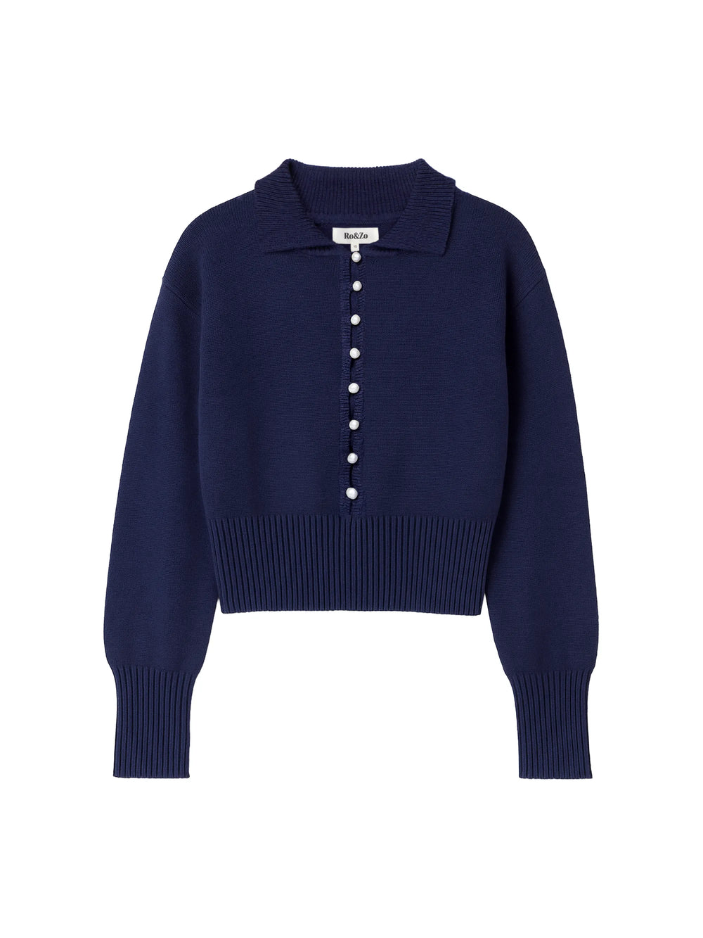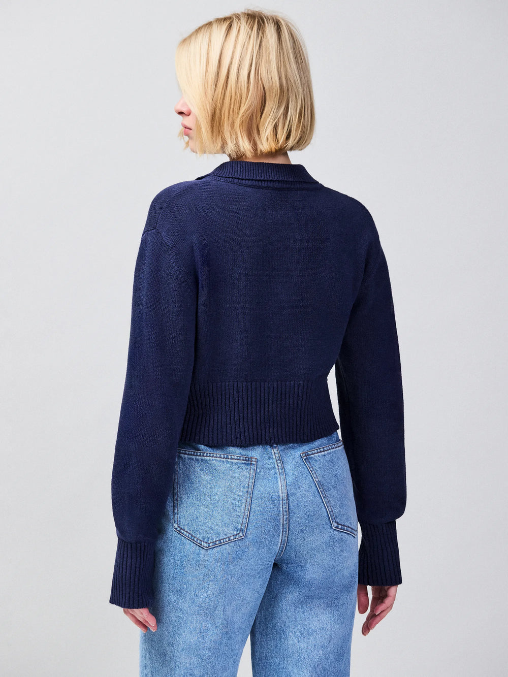 Clean lines meet subtle detail in this navy button-through cardigan. Crafted from a lightweight linen blend, it’s designed with a neat collar and a cropped silhouette that feels considered but never overdone. Pearl buttons add a quiet point of contrast, while ribbed cuffs and hem give the shape structure without stiffness. Style it simply with high-rise denim for an easy, everyday look, or layer under tailoring to bring softness to sharper pieces.