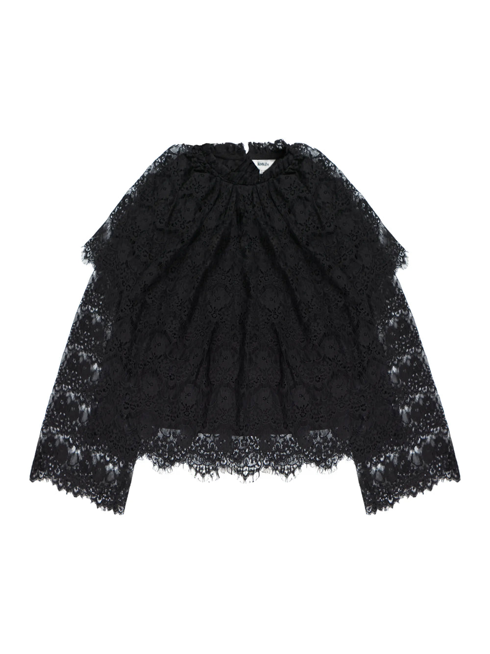 Tap into a bohemian sensibility with this elegantly ethereal blouse, crafted from fine black lace. It is distinguished by a cape-effect overlay and bell sleeves, adding to its breezy silhouette. We love the scalloped hem and cuffs, and frilled collar. Style it with a tonal bralette or with the accompanying camisole.