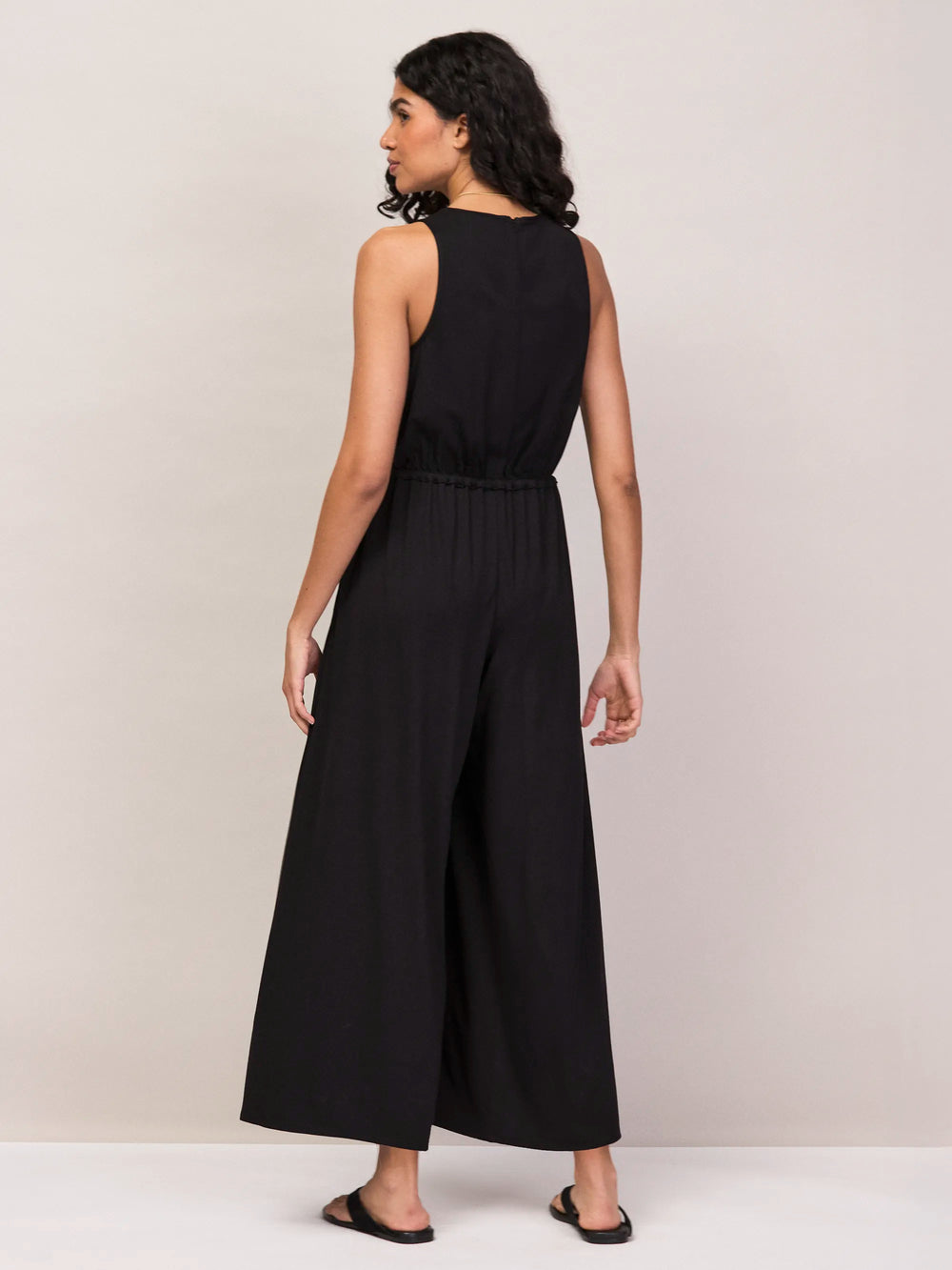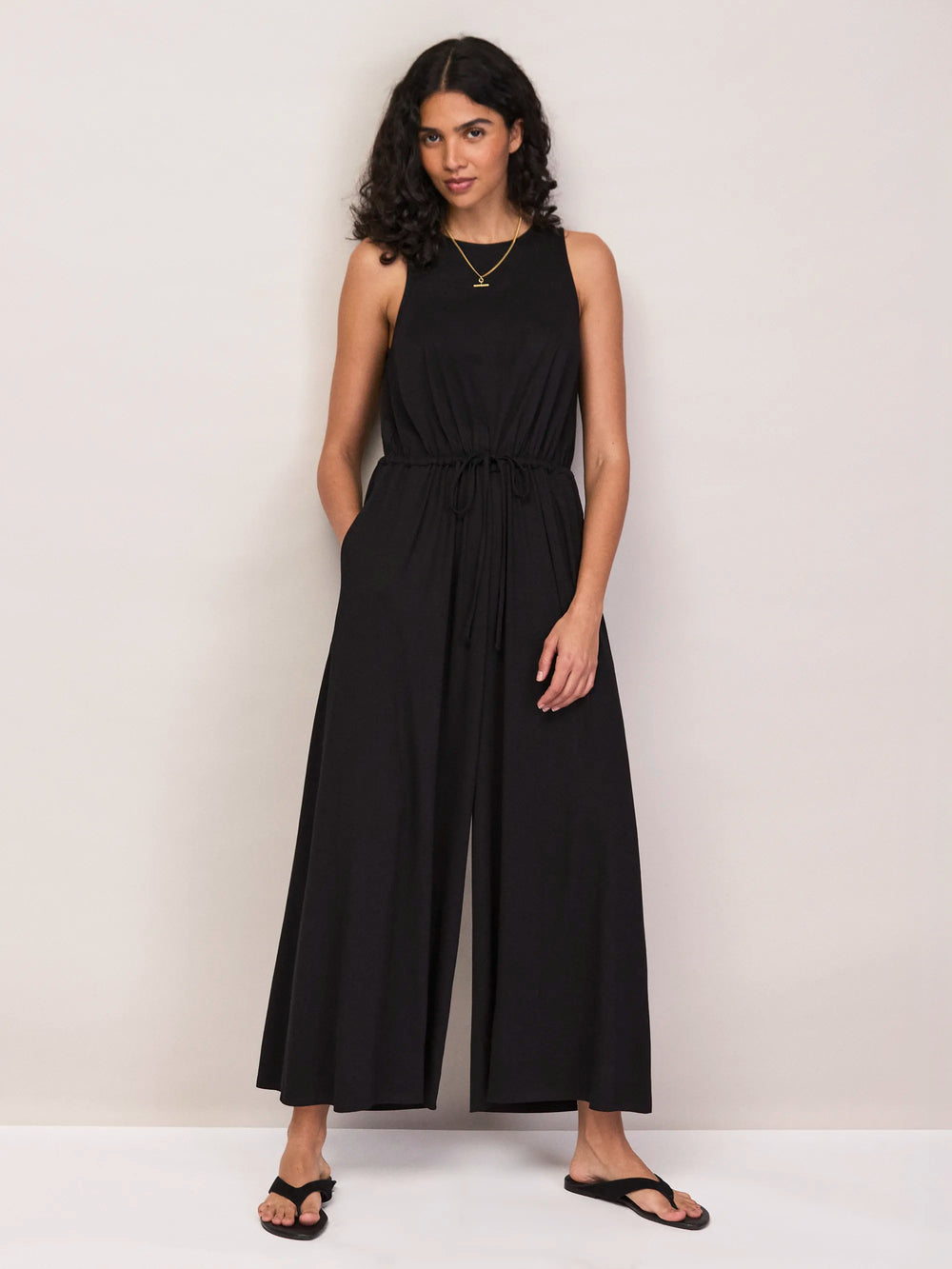 This is one of those effortless pieces you’ll wear on repeat all summer. Made from soft black jersey, it has a clean sleeveless shape with a drawstring waist to gently define the silhouette, before falling into easy wide legs. Keep it simple with flat sandals by day, or dress it up with gold jewellery and a sleek clutch. This jumpsuit is part of our petite collection, designed for those 5'3" and under.
