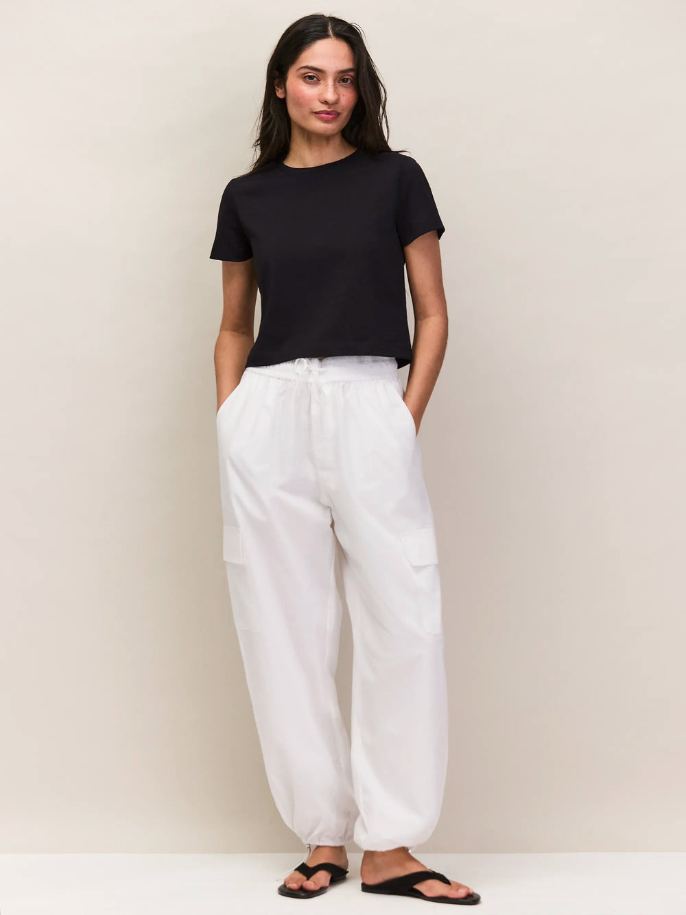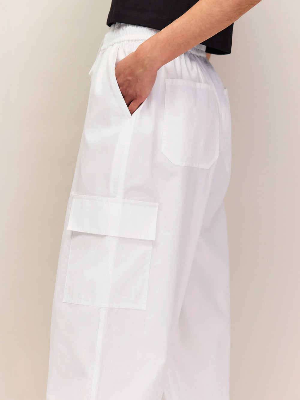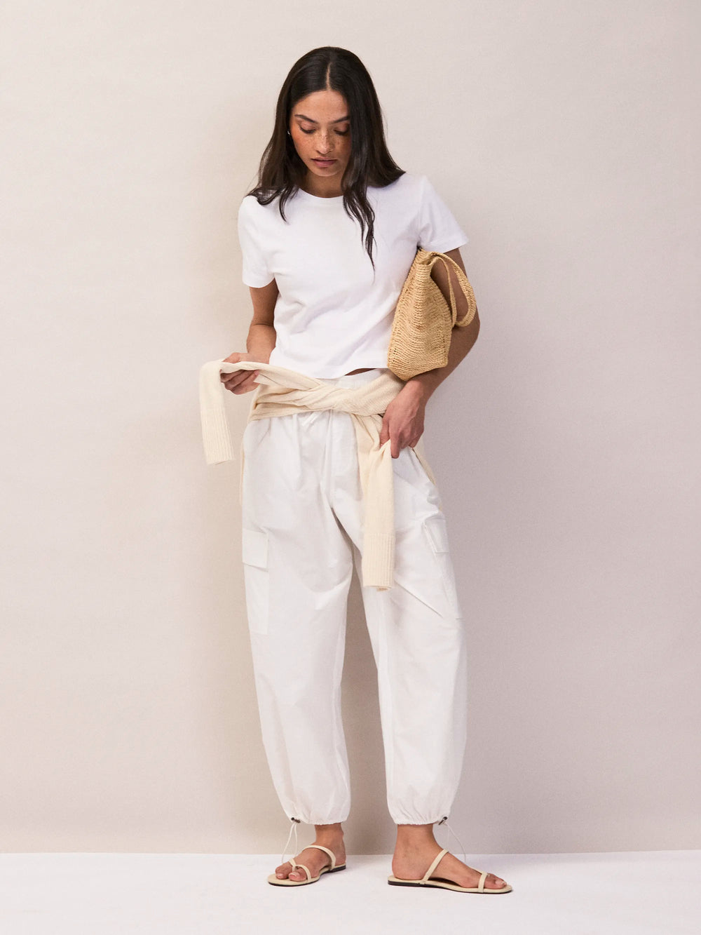 The perfect summer trousers, these are made from lightweight white cotton and distinguished by drawstring cuffs. They have a comfortable stretch waistband – complete with tie detail – and cargo pockets, lending a utilitarian feel. Style yours with a simple black tee and sandals. These trousers are part of our petite collection, designed for those 5'3" and under.