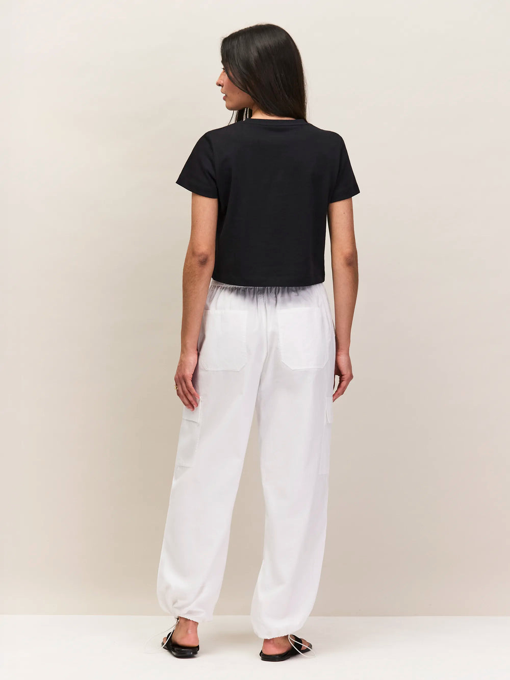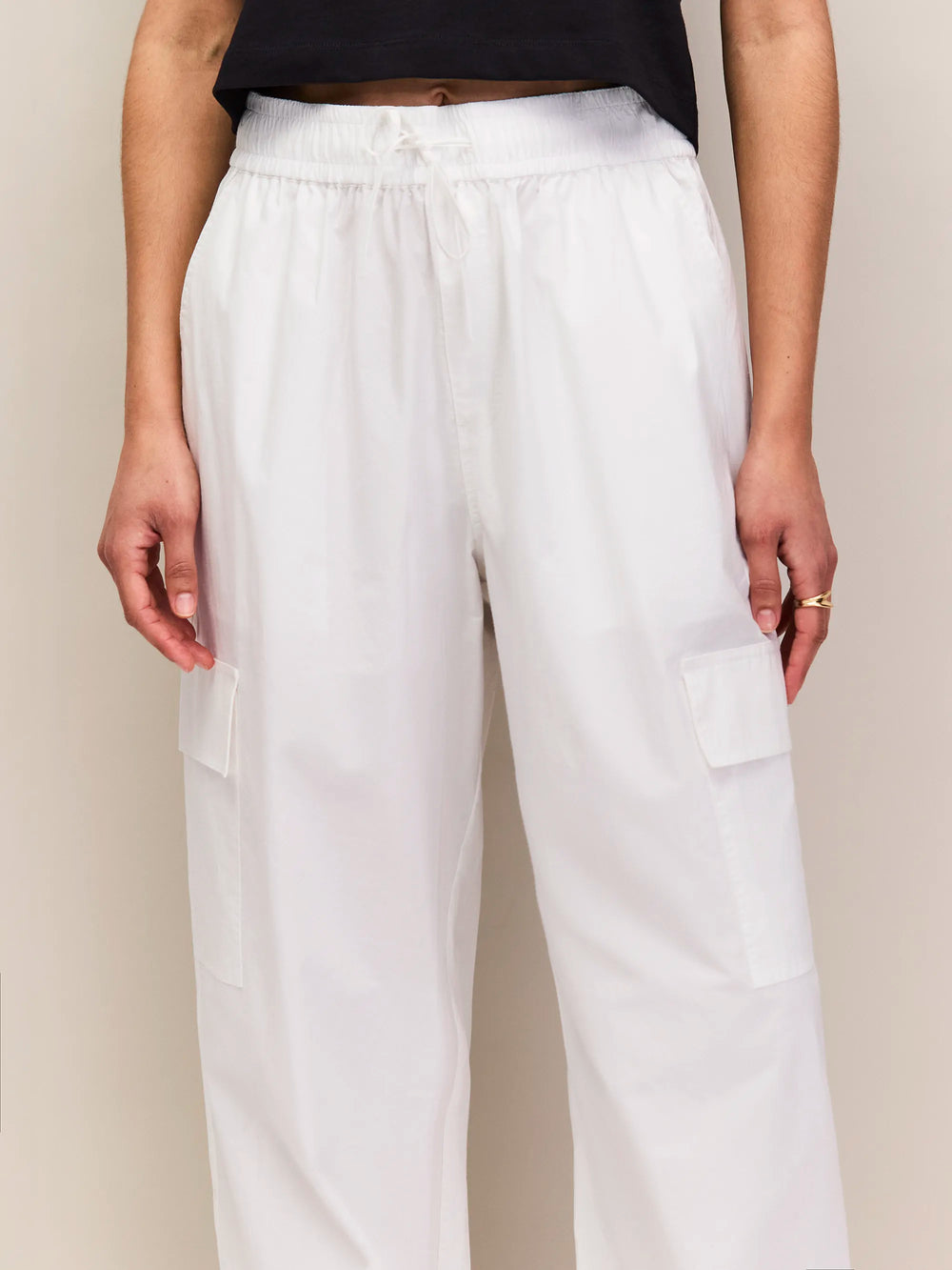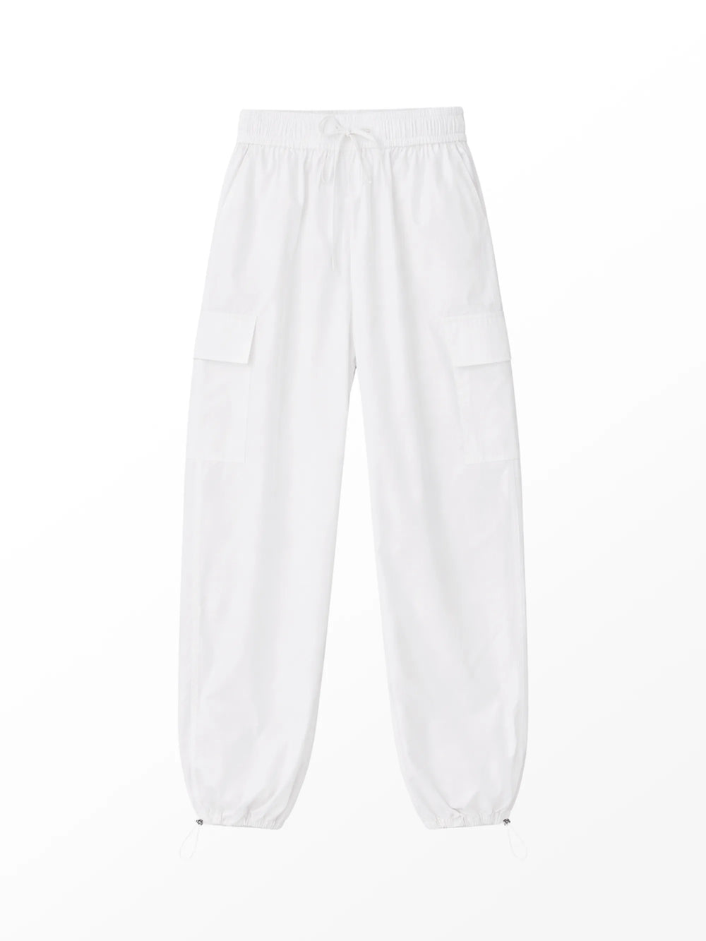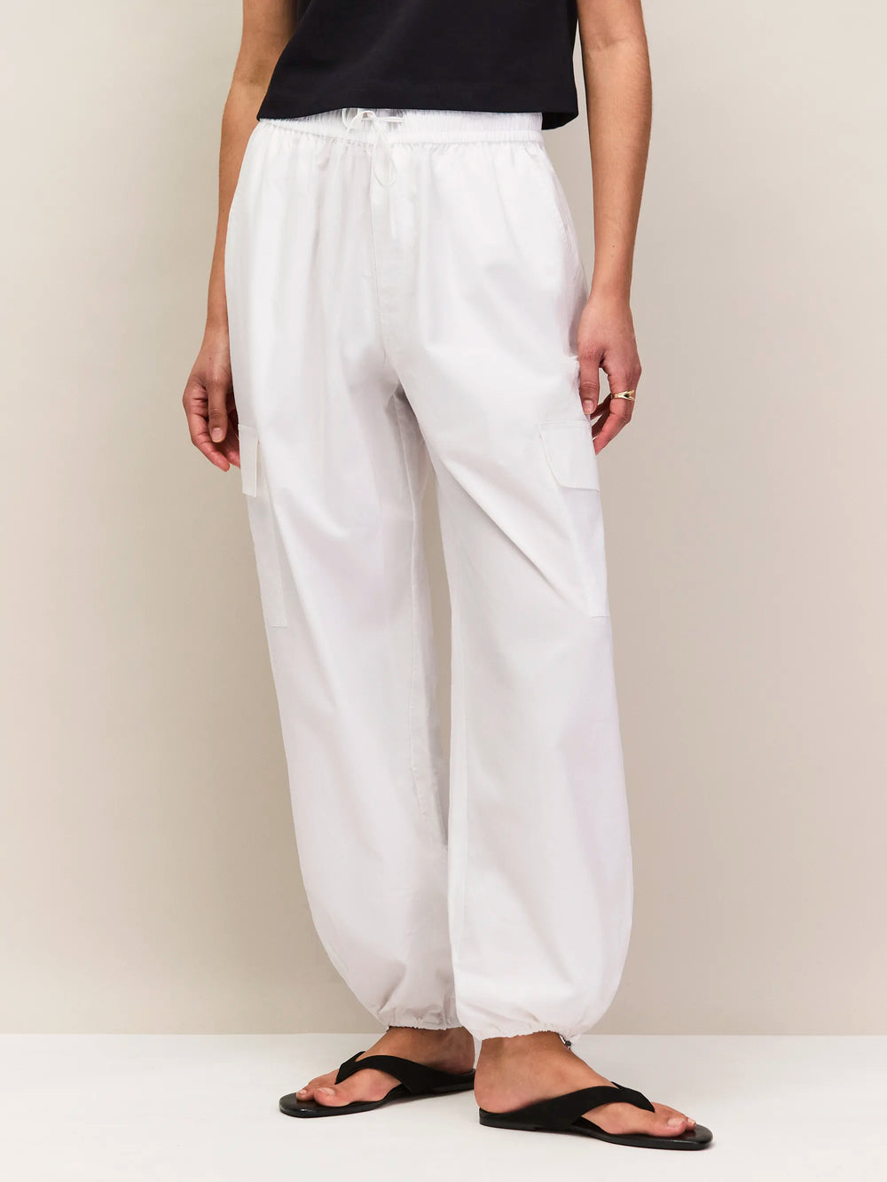 The perfect summer trousers, these are made from lightweight white cotton and distinguished by drawstring cuffs. They have a comfortable stretch waistband – complete with tie detail – and cargo pockets, lending a utilitarian feel. Style yours with a simple black tee and sandals. These trousers are part of our petite collection, designed for those 5'3" and under.