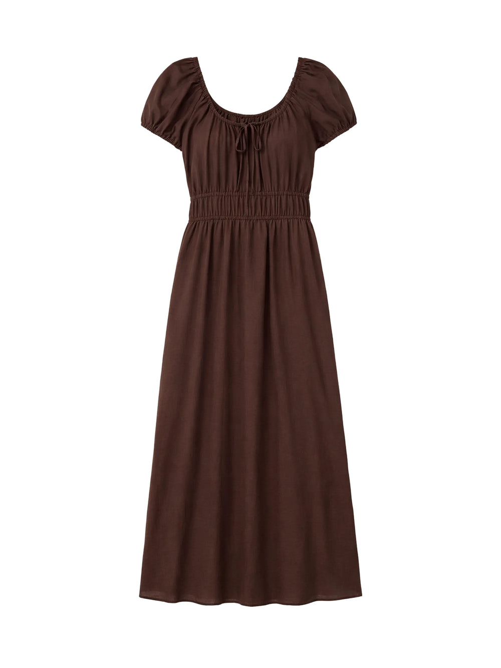 In chocolate-brown voile, this airy midi dress is perfect for summer days. It comes fully lined for coverage, with gathered short sleeves, a pretty scooped neckline and a ruched waistband that cinches the figure. Team yours with coordinating ballet flats and an oversized tote.