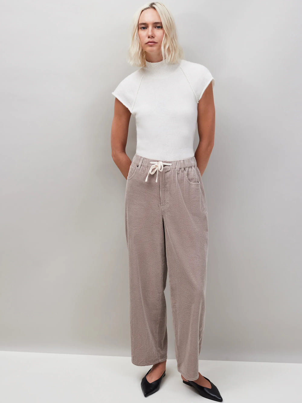 Elevate your everyday wardrobe with these Cord Drawstring Waist Trousers, crafted in a cappuccino wash for timeless appeal. The high-rise, slim barrel leg silhouette creates a flattering, modern shape, while the elasticated back waist, drawstring, and fly zip ensure effortless comfort and a tailored fit. Perfectly versatile, these trousers can be styled with a tucked-in blouse for polished office looks or layered with a relaxed knit for casual sophistication.