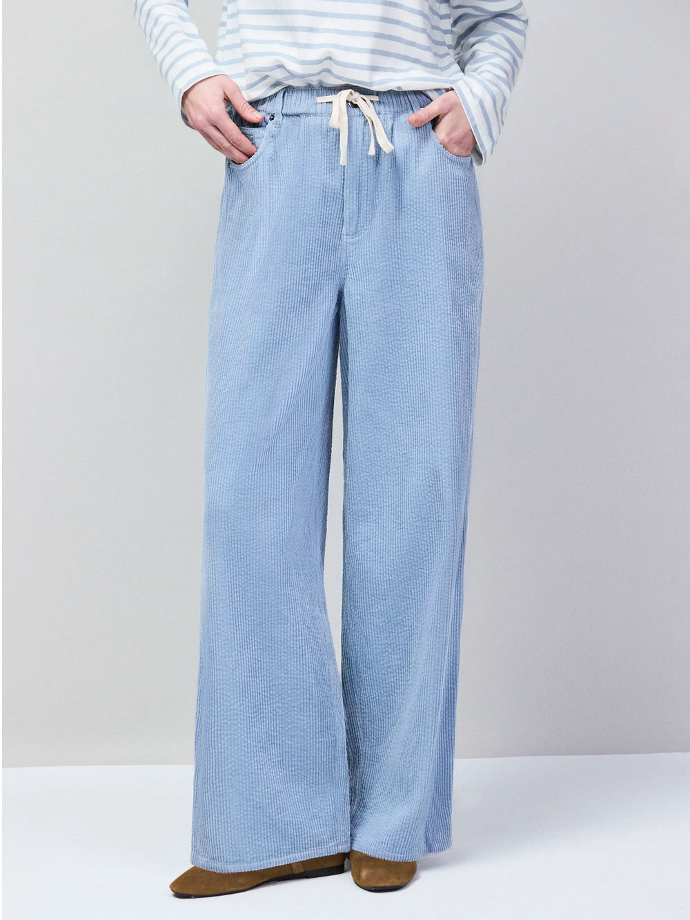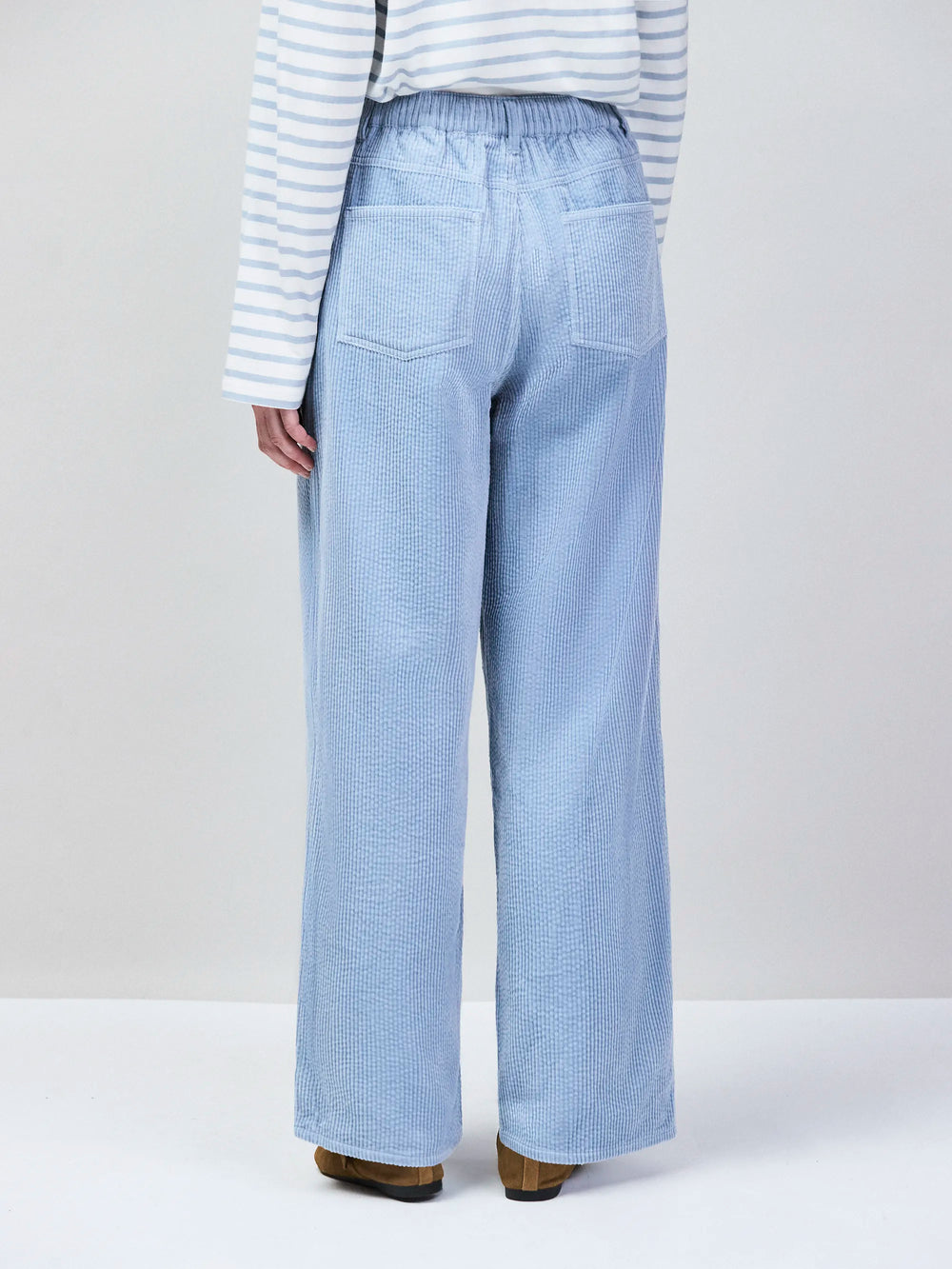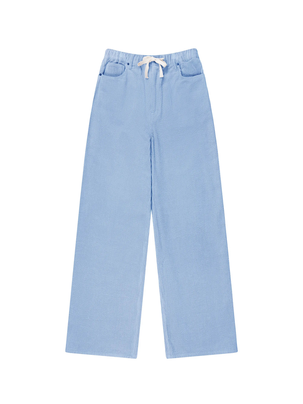Cut from soft corduroy, these light blue trousers balance ease with subtle structure. A mid-rise fit with an elasticated back and drawstring waist offers everyday comfort, finished with a clean fly zip front. The slim barrel leg creates a modern, relaxed silhouette. Style with a striped long-sleeve tee or fine knit for laid-back days, or pair with a crisp shirt and loafers for a more polished feel.