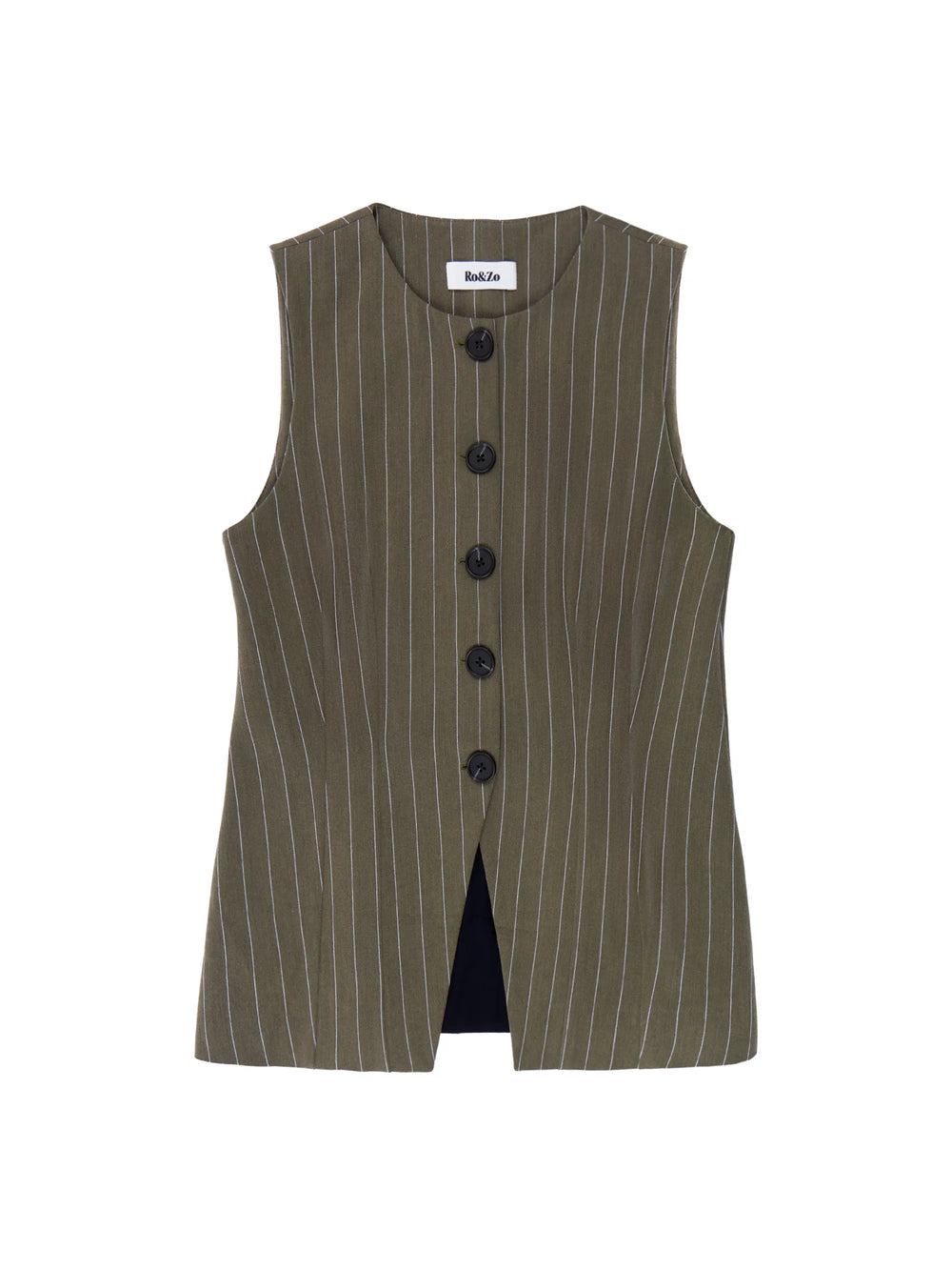 Sharp, minimal and beautifully tailored, the Olive Pinstripe Waistcoat offers a modern way to elevate everyday dressing. Cut with a high round neckline and detailed with front bodice darts, it creates a clean, elongating line through the body. The functional button front and full lining ensure a smooth, refined fit, while the fine pinstripe adds a subtle touch of structure. Style it with the matching Olive Pinstripe Tailored Trousers for a sleek co-ordinated look, or pair with denim for a polished, effortless contrast.