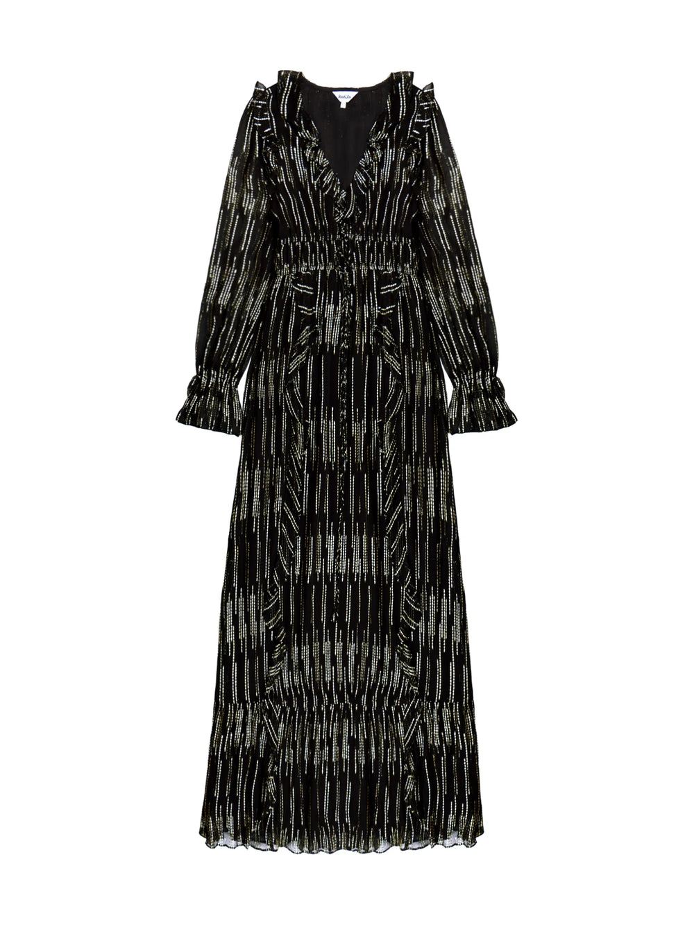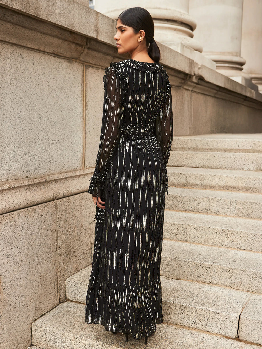 Understatedly glamorous, the Lydia dress glimmers with gold foil detailing, designed to sparkle in low light. It is crafted from black chiffon and elevated by ruffles, a ruched waist, and tie-detail cuffs. It's lined, for coverage, but we've left the sleeves a little sheer for a glimpse of skin. Style it with pointed boots for an effortless evening look. This dress is part of our Petite collection, designed for women who are 5'3" and under.